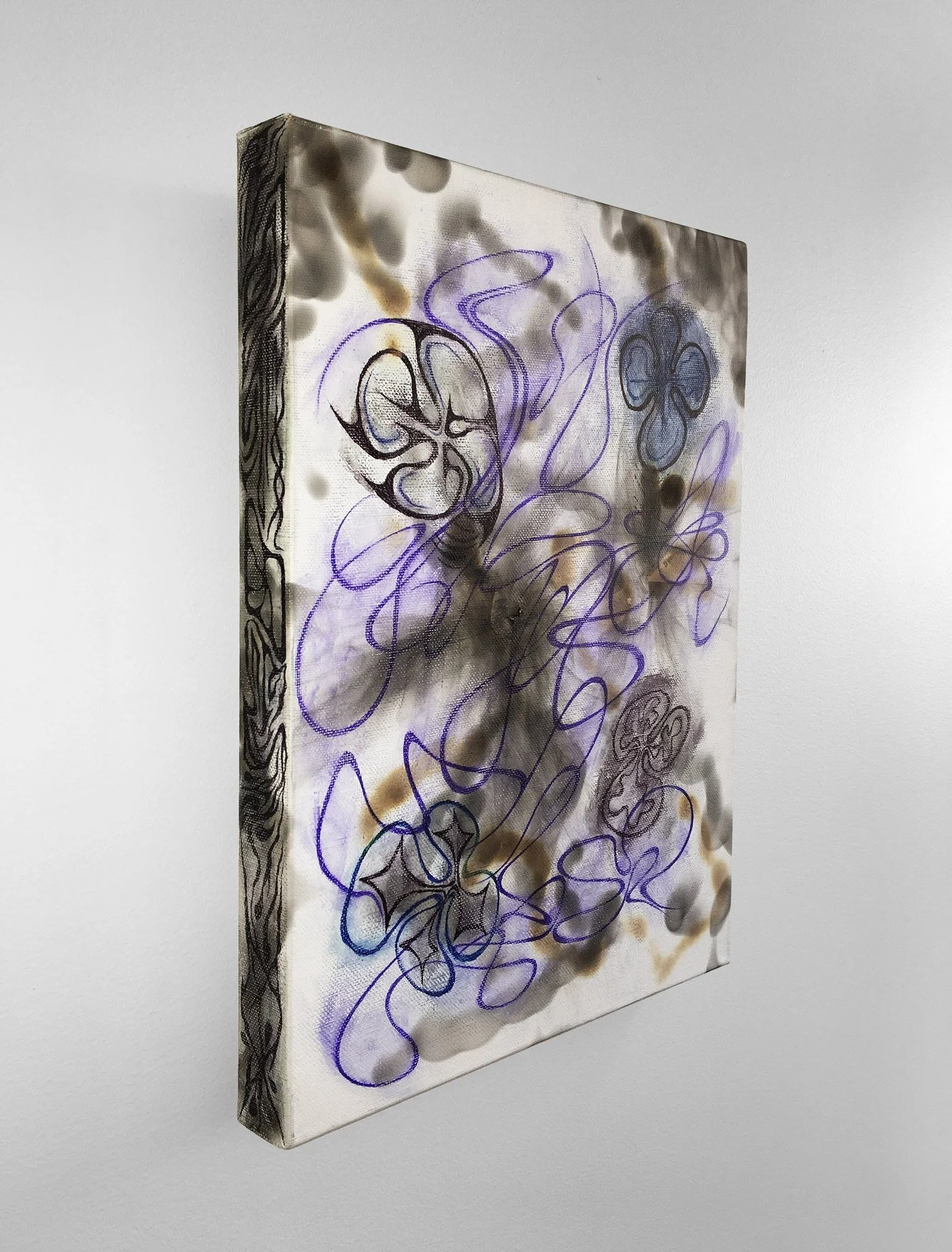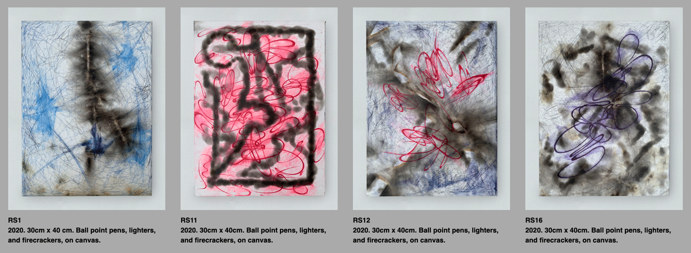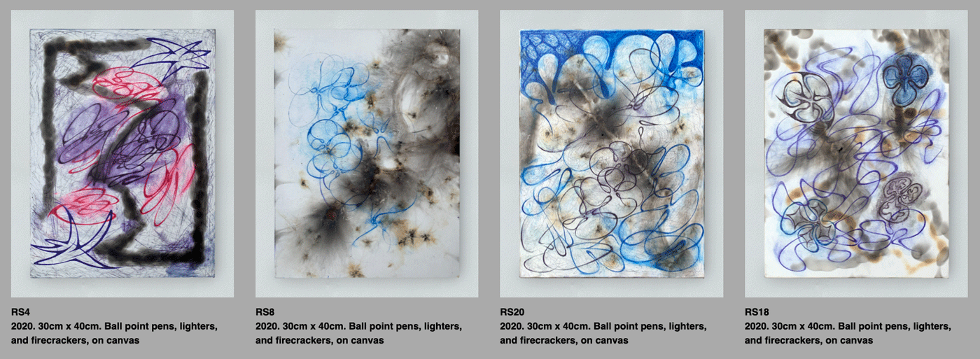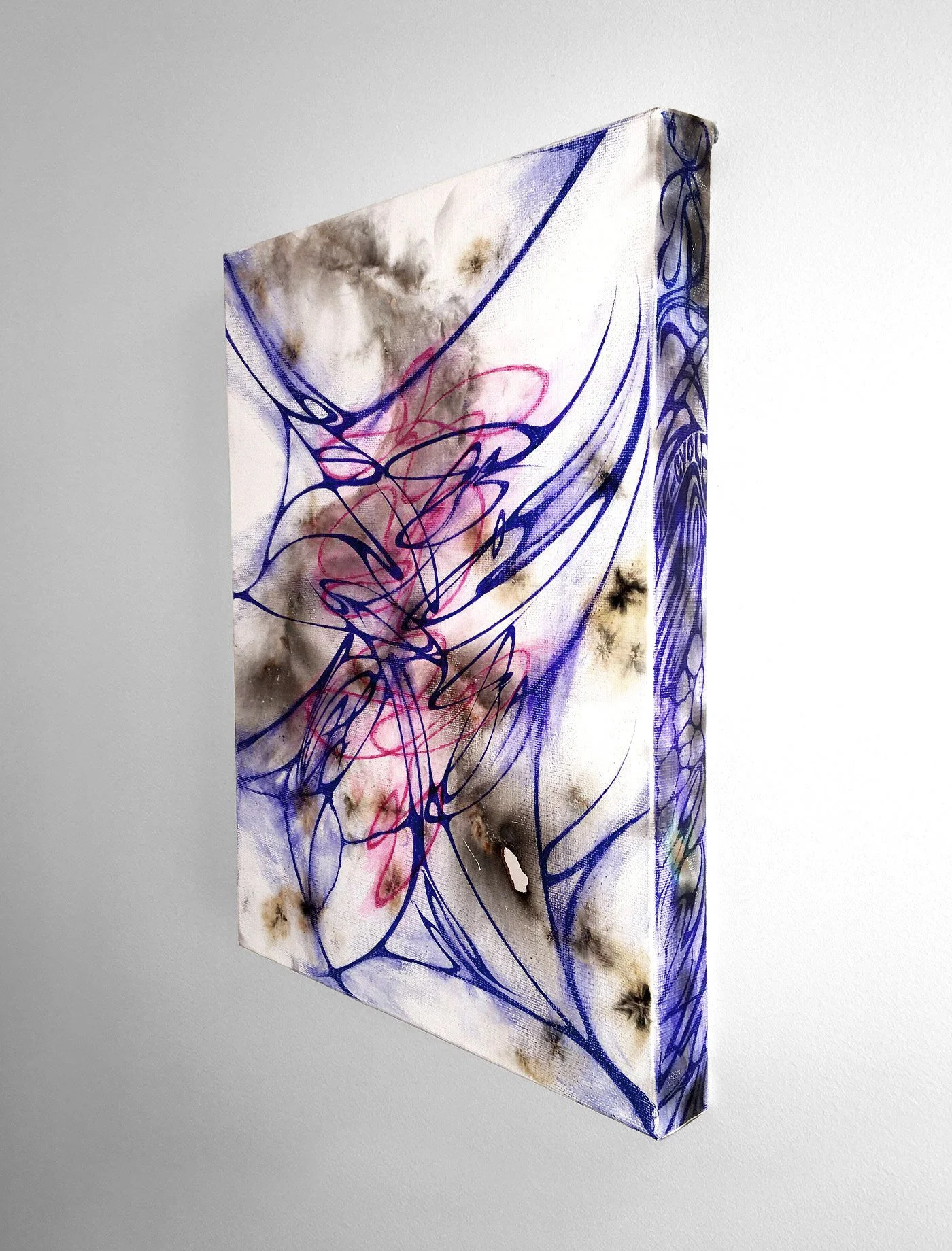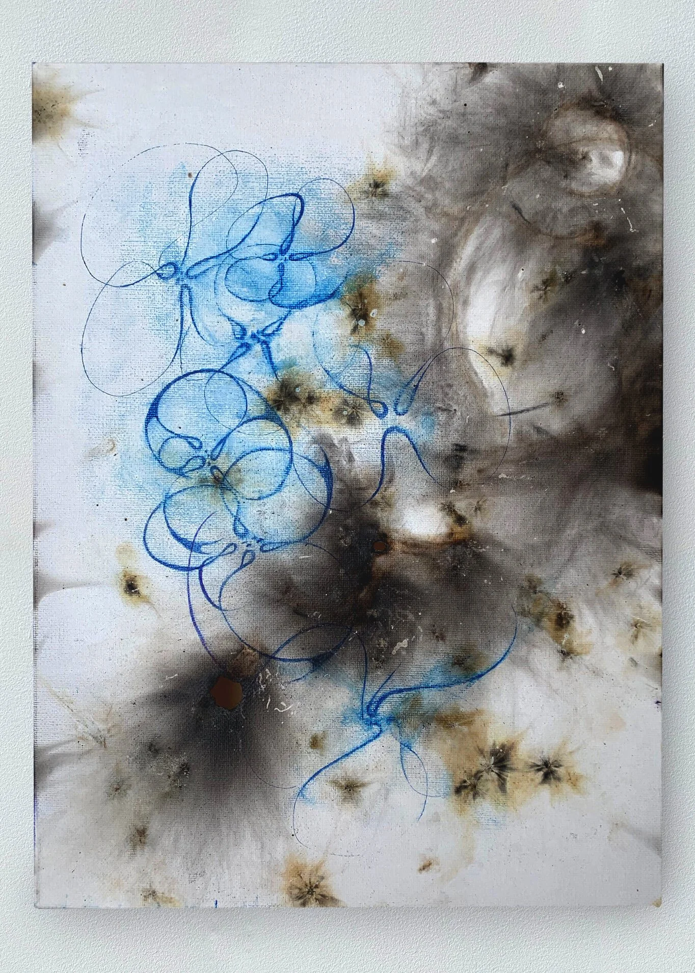 Material/Technic: Pyrotechnics, ballpointpen (ink), Varnish on canvas