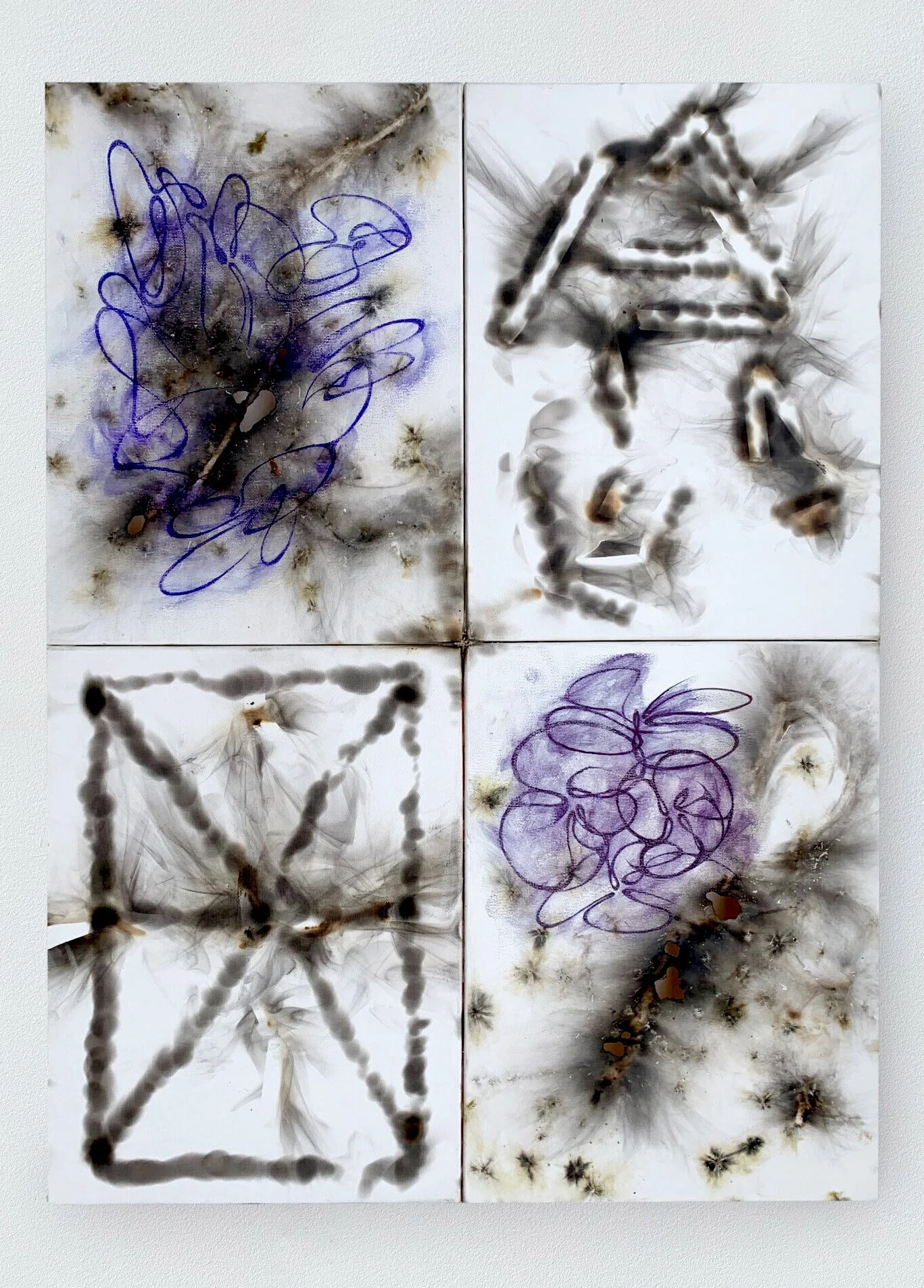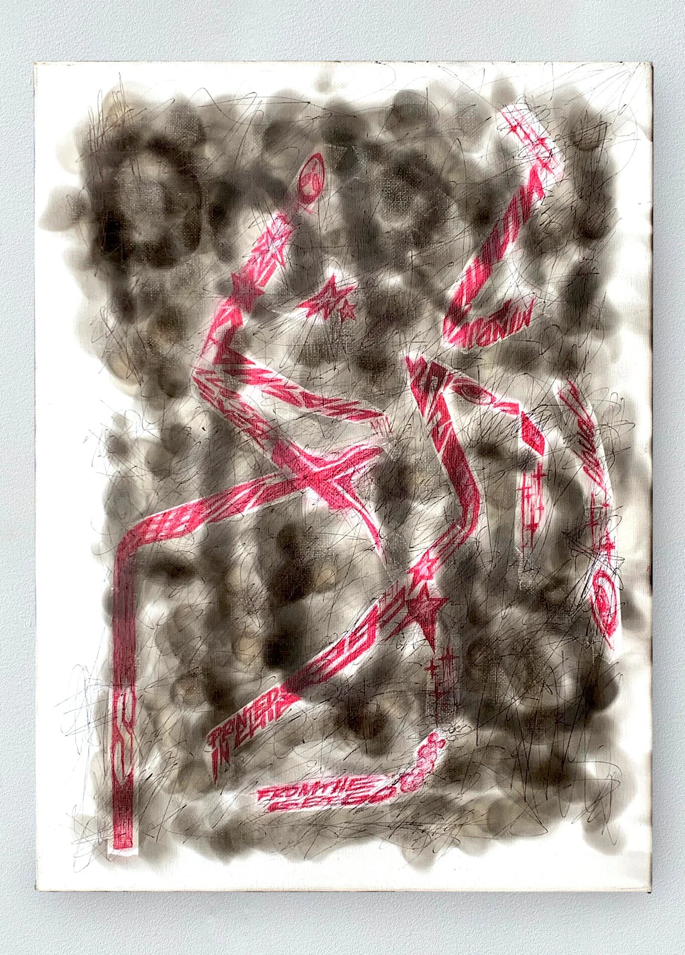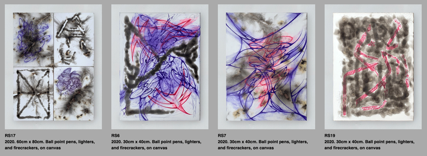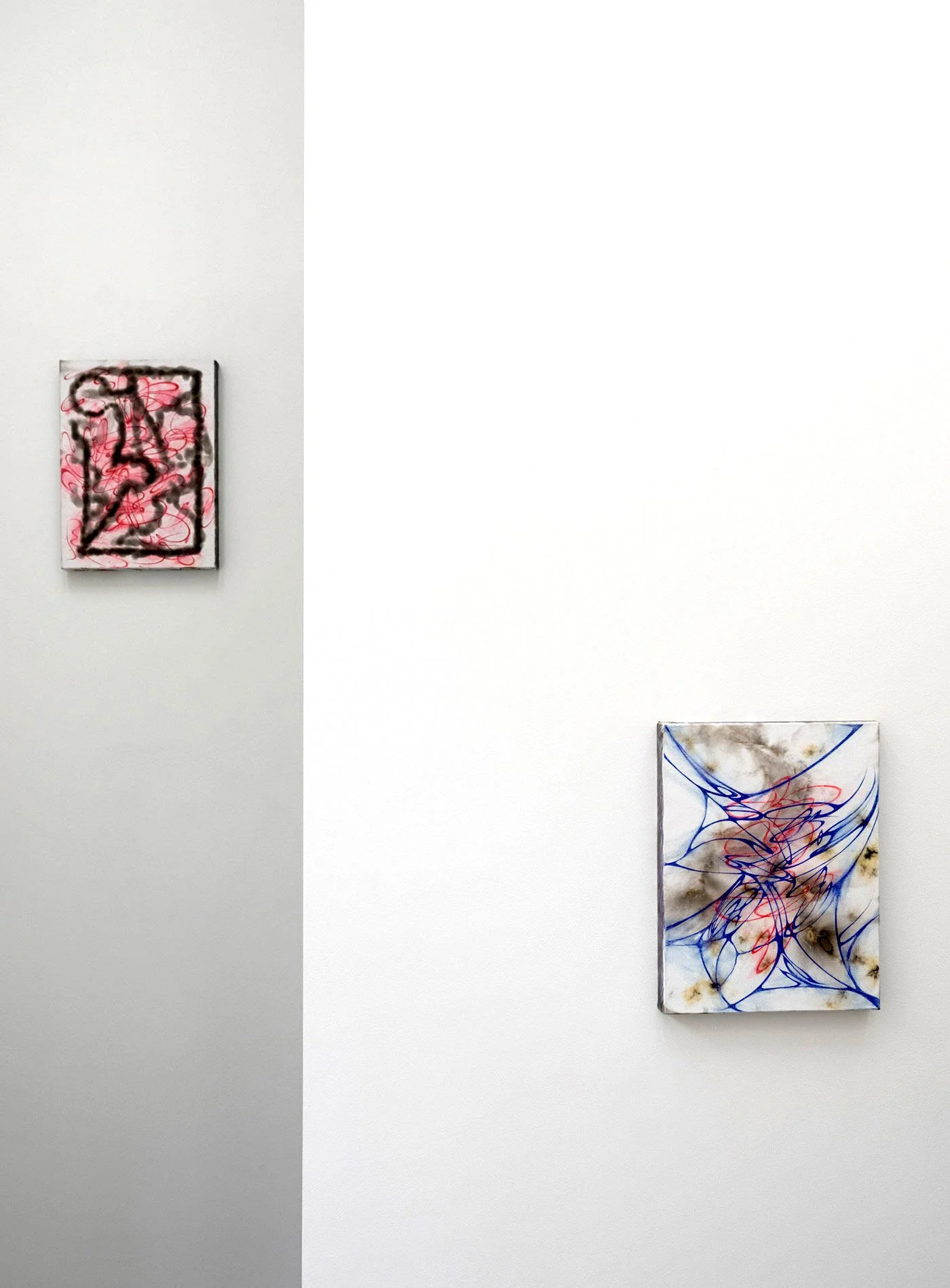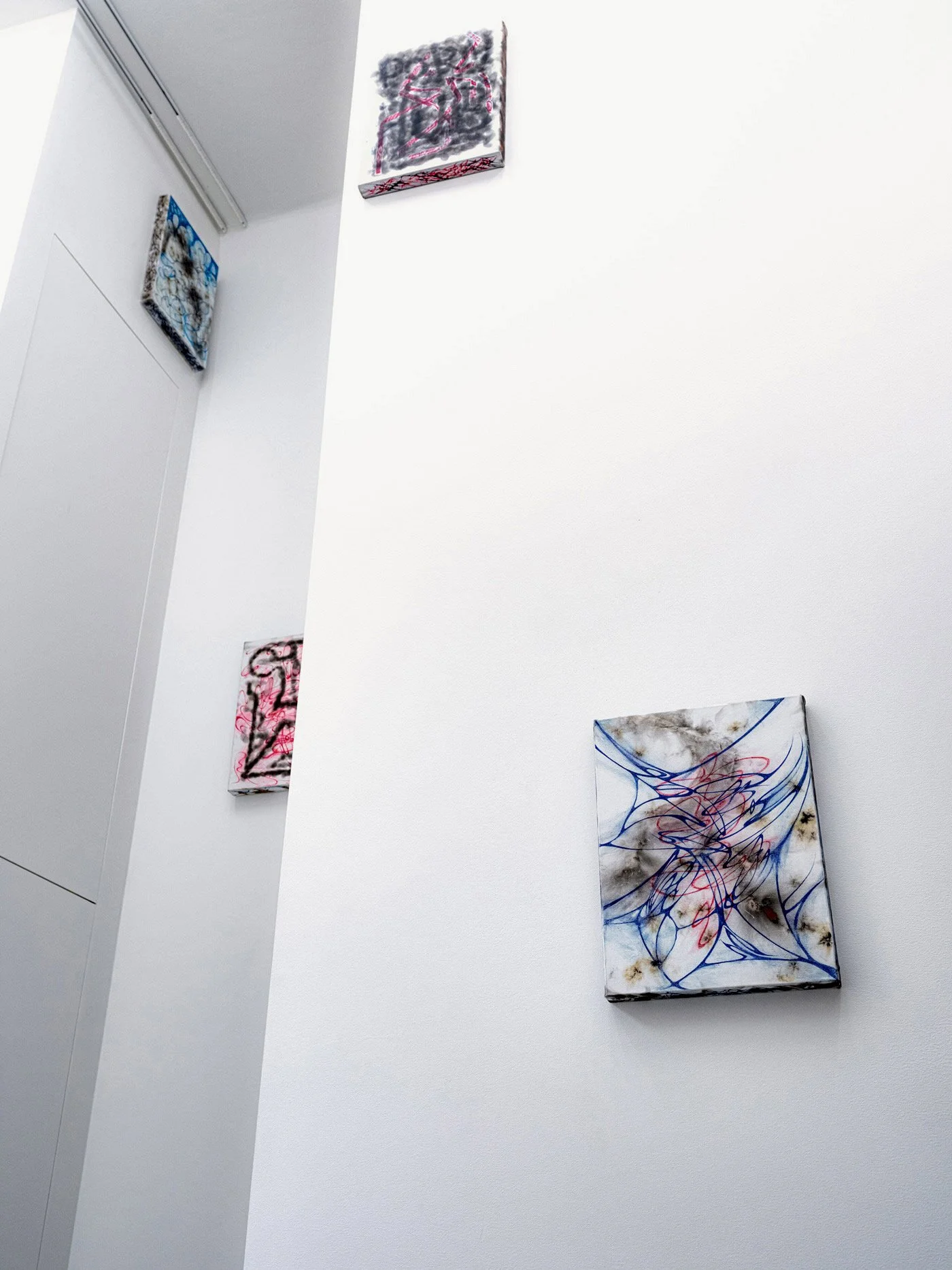 Slobodan Zivic is best known for working with contemporary and technological materials and methods. In his new solo exhibition, however, he goes back to his roots to work with simpler means, and with drawing in focus. For Zivic, drawing became a way of processing his experiences during the turbulent years of growing up. Over time, drawing developed into rituals in everyday life, and thus gained a symbolic value beyond the original therapeutic purpose. Expressing oneself creatively in this way became a way of developing as a person and thus became a rite of passage to adulthood. With a present global crisis, which has once again created a turbulent existence, Zivic has in his new exhibition turned to his vulnerable safe haven and recreated the rituals, but in a new version. Inspired by his childhood in the former Yugoslavia, Zivic has used means such as ballpoint pens, lighters, and firecrackers. Something that made a strong impression on him was how messages were often burned along roofs, under stairs, and over corners and edges, both inside and outside buildings. A way that he experienced as unique to this time and place. In his new works, Zivic lets these burn marks, together with the drawings, spread over the edges of the canvas, thus transforming the two-dimensional surfaces into three-dimensional sculptures. In the abstract expression, however, he transforms the messages on the walls and ceilings into the child's wordless and associative expression.