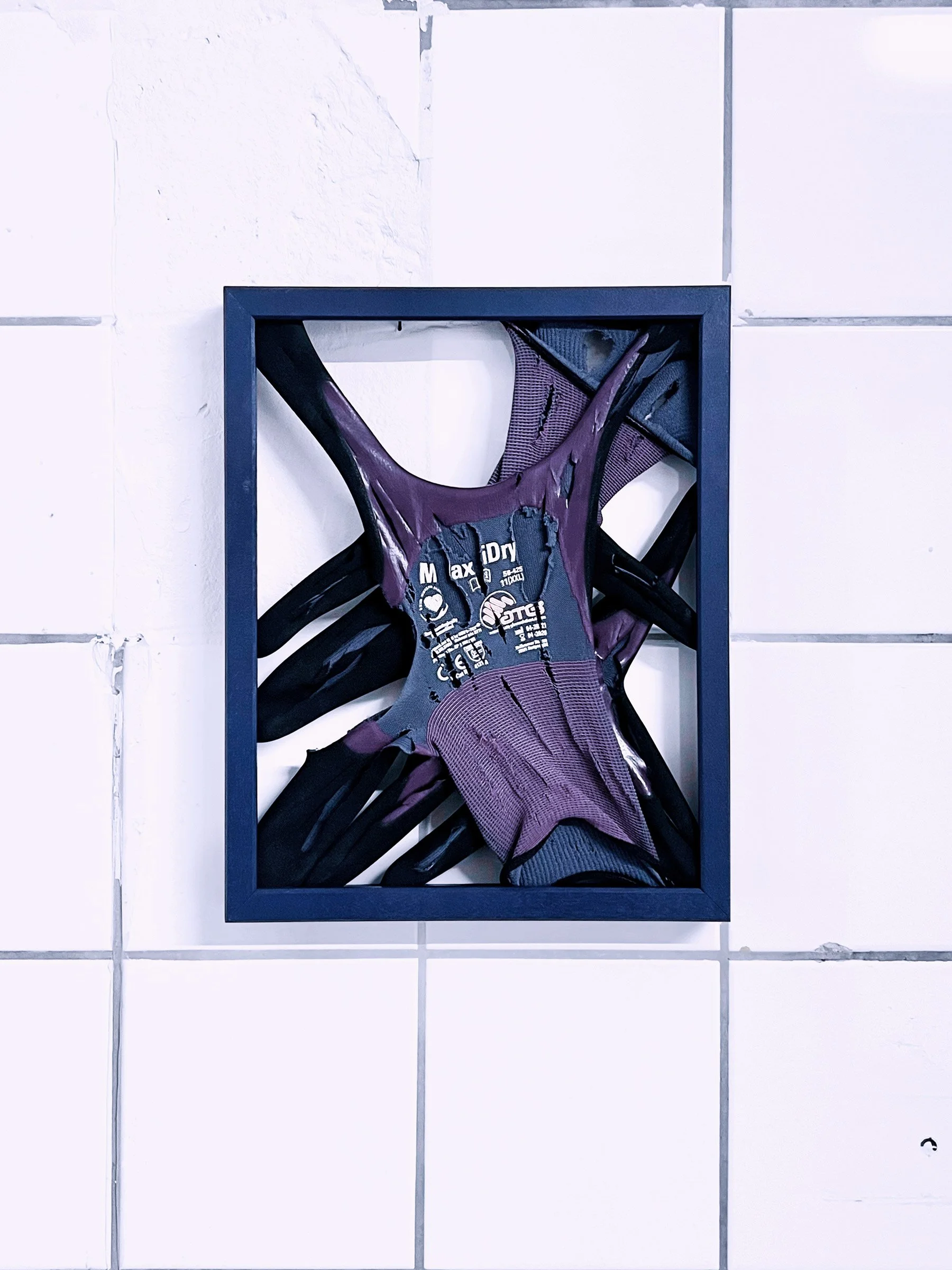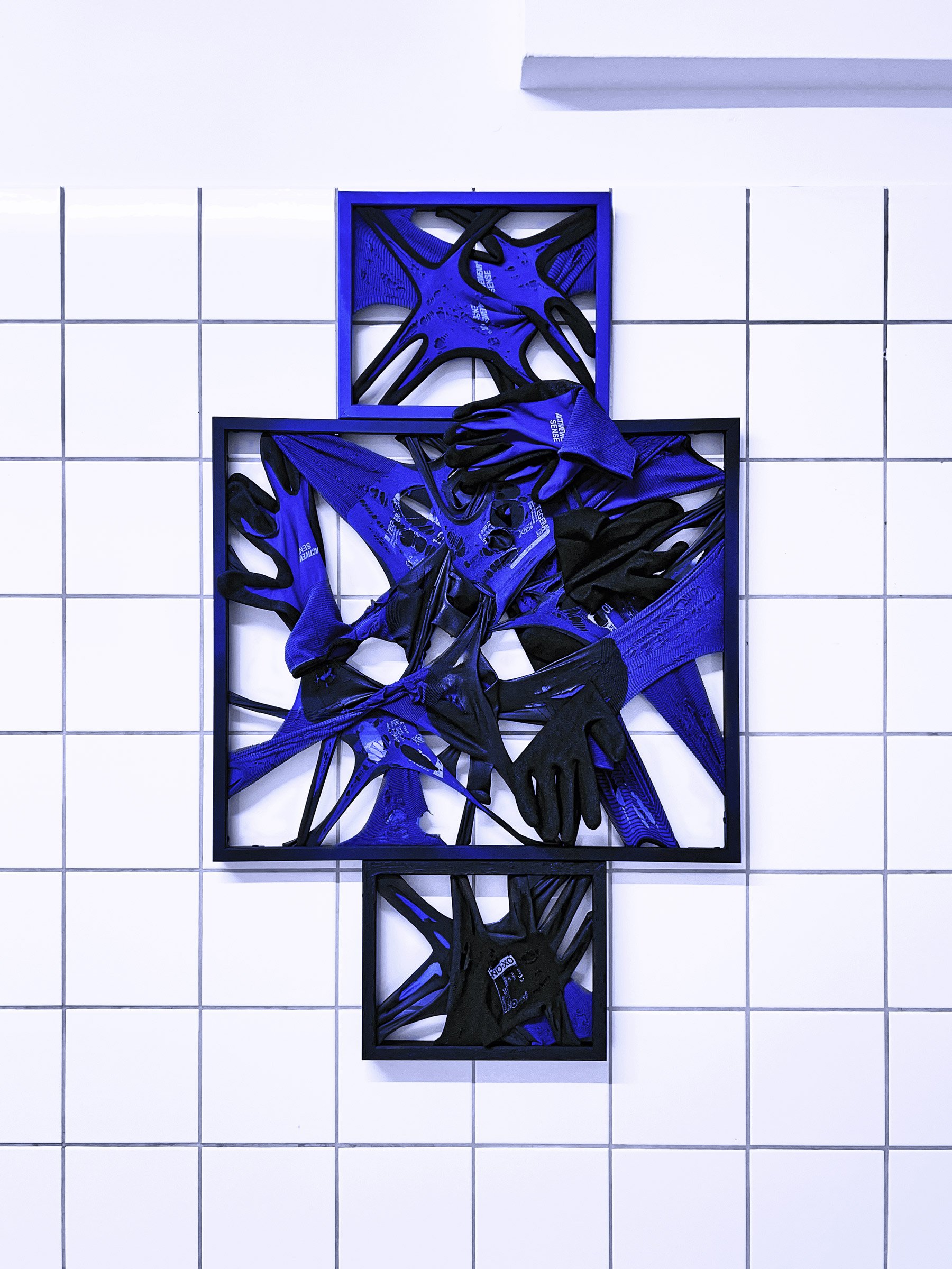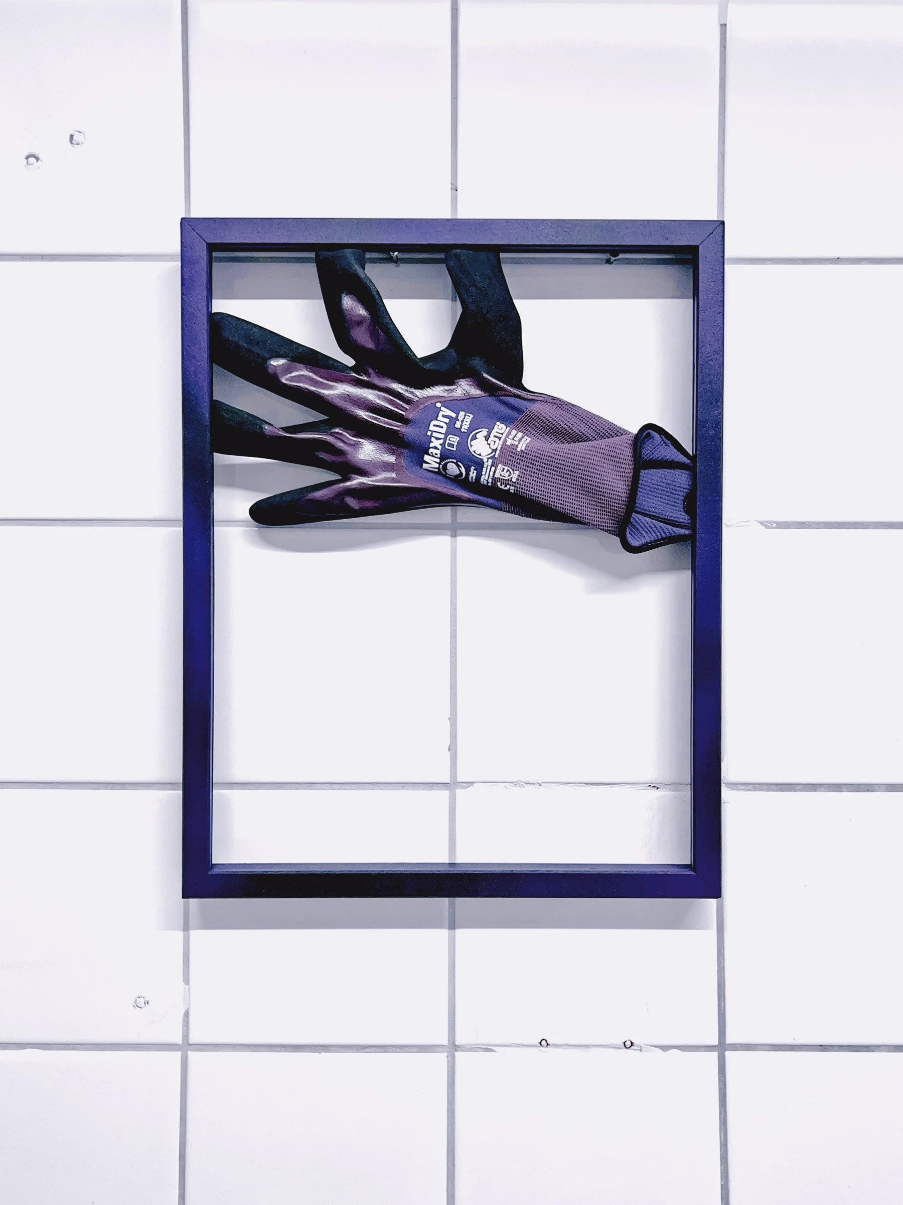 Burden, 2023, Safety gloves on spraypainted wooden frame, 130x25, 57x48, 28x21cm
