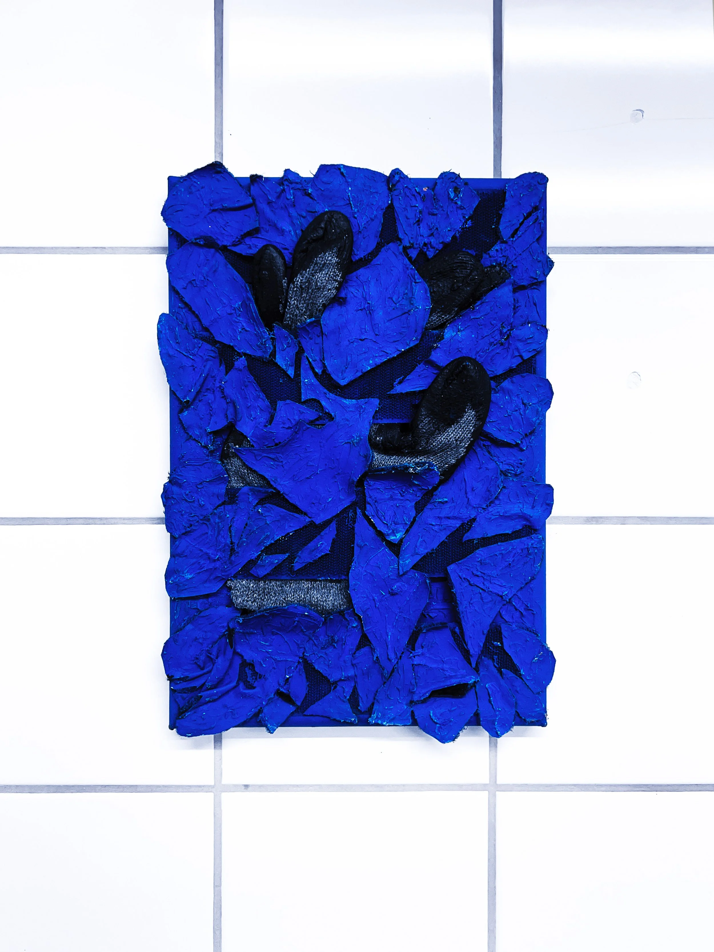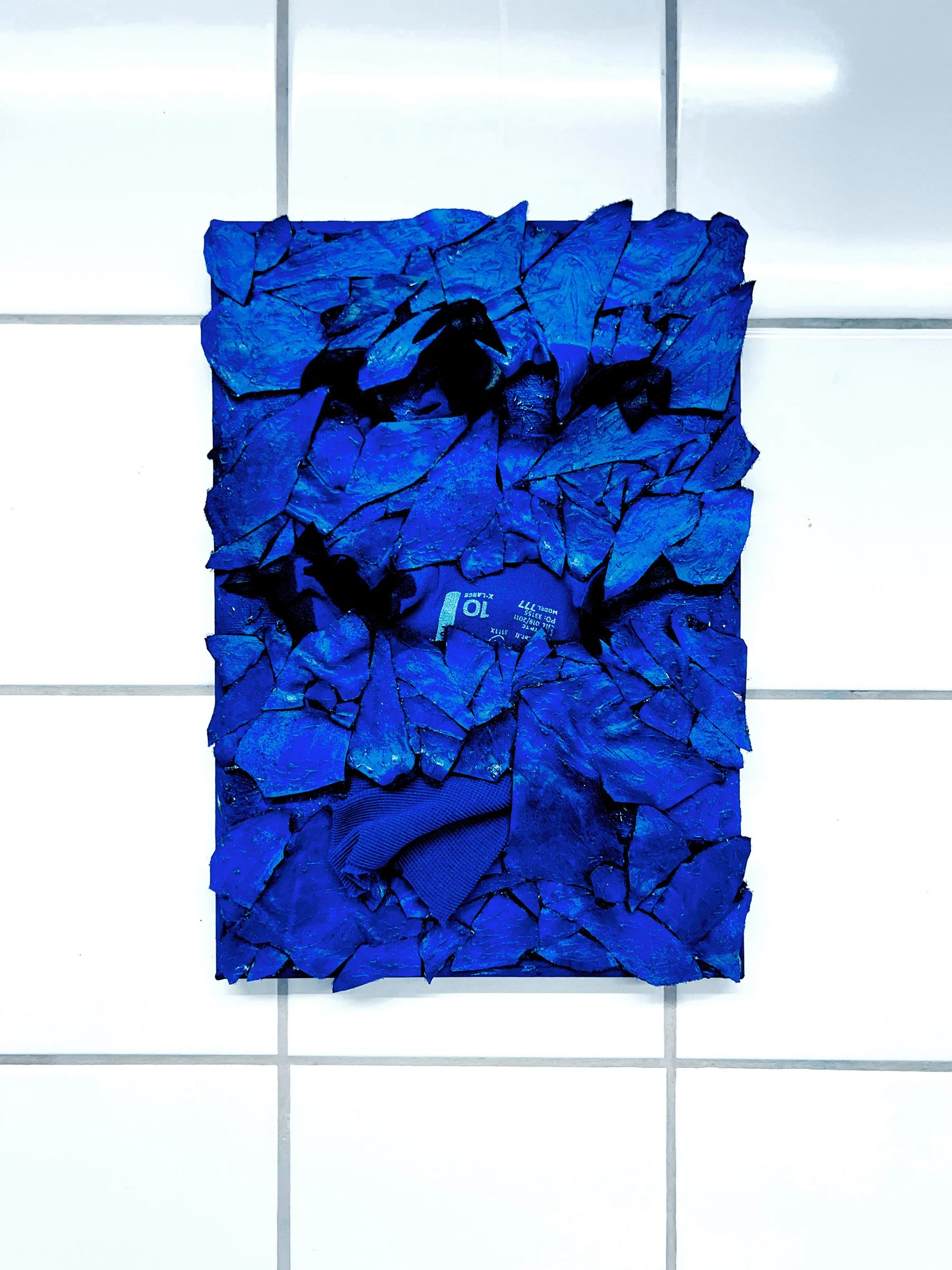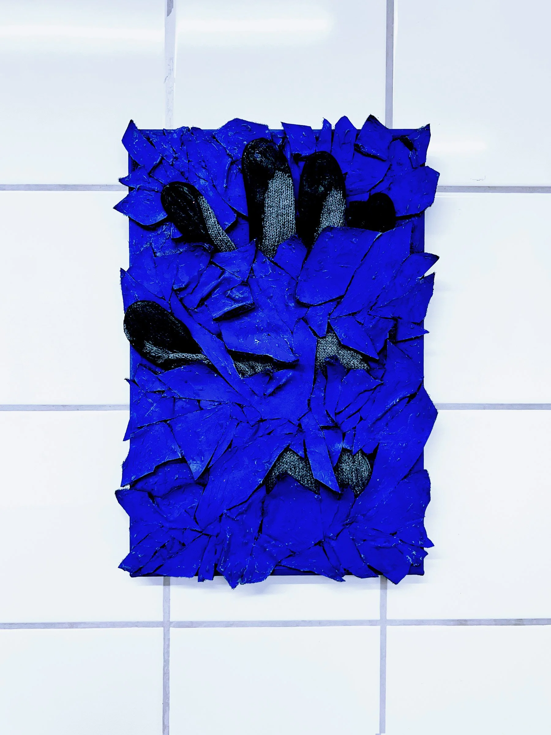 Distorted pleasures, 2023, Digital print on textile, velcro, spraypaint, safety glove, acrylic latex on canvas. 20x30cm