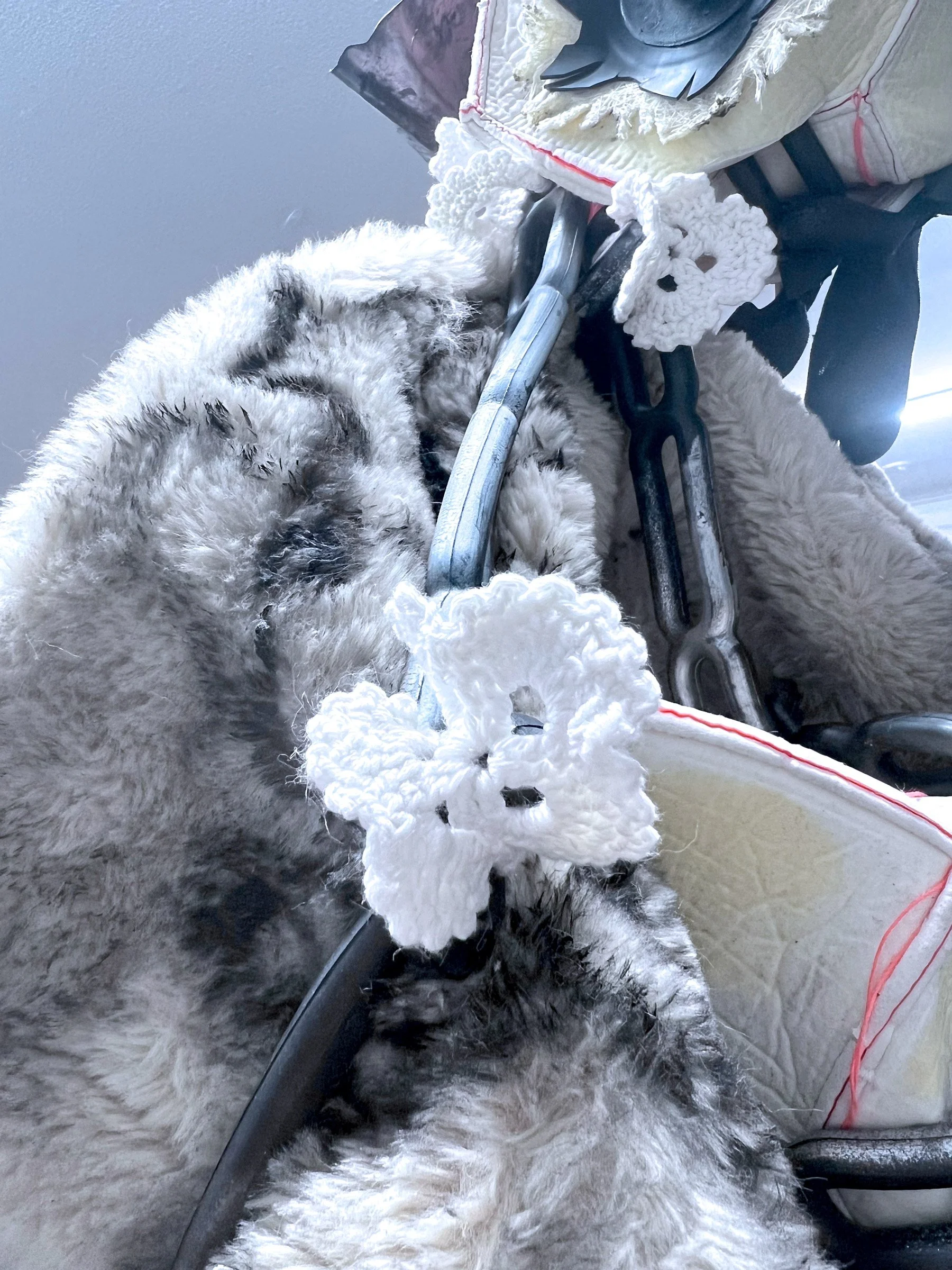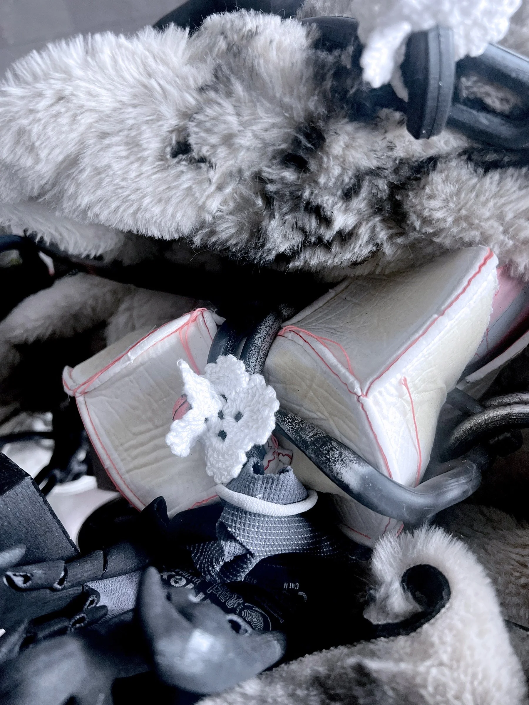 Quick to sway, 2023, Fake leather jacket, rubber holders, spray, safety gloves, wooden frame, linen canvas, spray, soccerball, crochet flower. 50x140cm